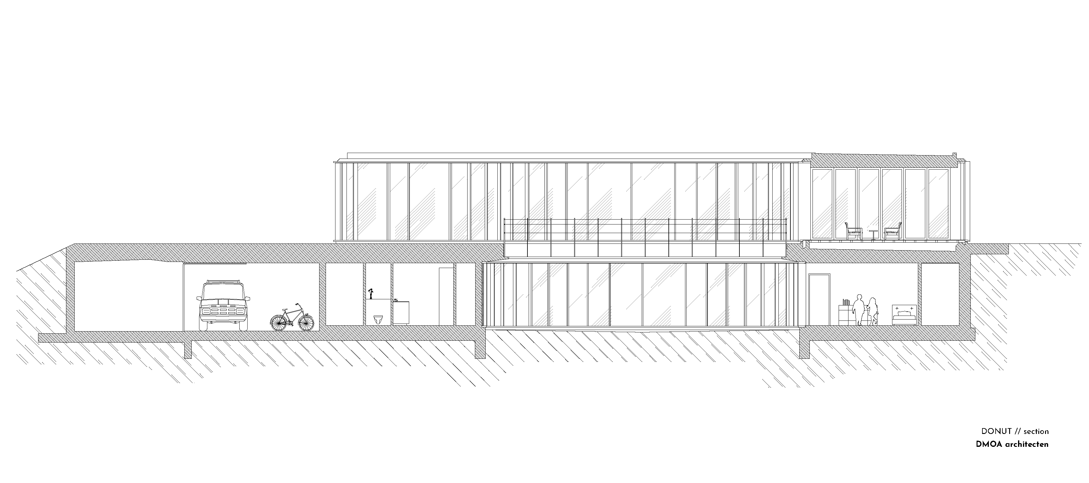 Het bouwperceel ligt in een straat met een natuurlijk talud, waarin de benedenverdieping van de woning volledig uitgegraven werd. Hierin bevinden zich de kinderkamers, die elk uitkomen op de intieme binnenpatio.